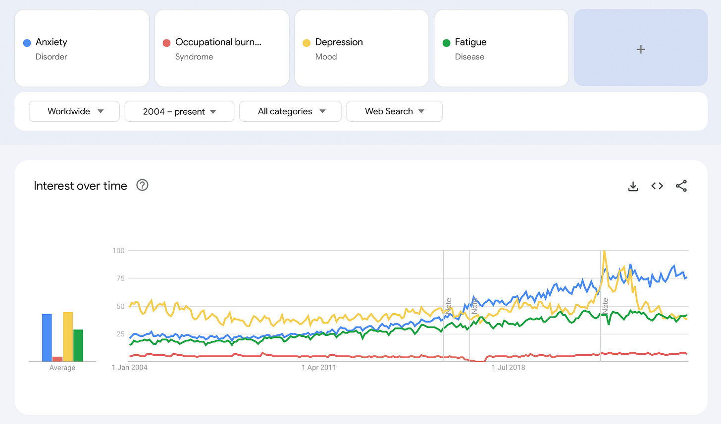 Consequences of burnout include structural and functional brain changes, systemic inflammation, immunosuppression, cardiovascular disease and premature death. Not a great way to live now, nor for long. Looking at Google Trends for the past two decades, it’s interesting to see that ‘burn-out’ hasn’t gotten more hits, despite every news outlet and company declaring a sharp increase amongst employees. So why is that? Are people not aware of the term? Can we only name proxy emotions? Or, do we simply not realise how impactful stress is until it’s too late? Searches for ‘anxiety’ have been on the rise since 2011, comfortably overtaking both depression and fatigue, even during covid.