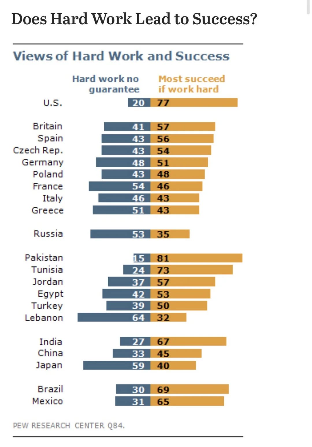 It seems that most people are aware of the fact that hard work and success are correlated, but not causational. (This research is from a decade ago, and I have a feeling that the American Dream might not be so alive and well at this point.)