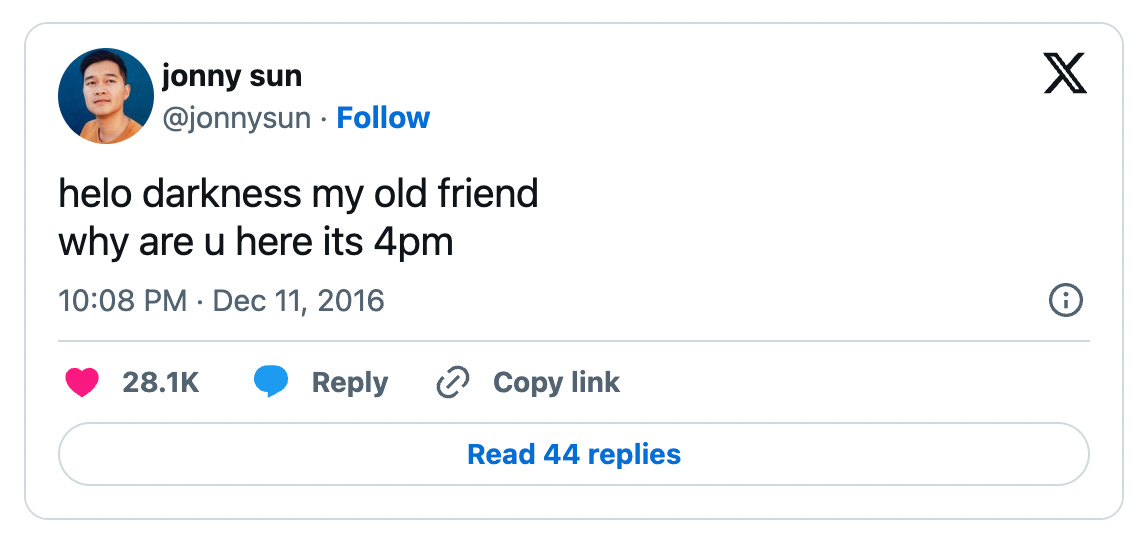 I know for a fact that the darker hours are a hot topic in everyone’s group chats right now, because apparently we are once again collectively shocked by how early it gets dark. Like this tweet going viral each winter without exception since 2016. So I’ve been thinking about how darker days affect health - if at all - and how the accumulation of our attitudes and behaviours on winter impact our long term life quality. After all, we spend about 1/4th of our lives in winter time. How sad would it be to hate a fourth of our lives by default?