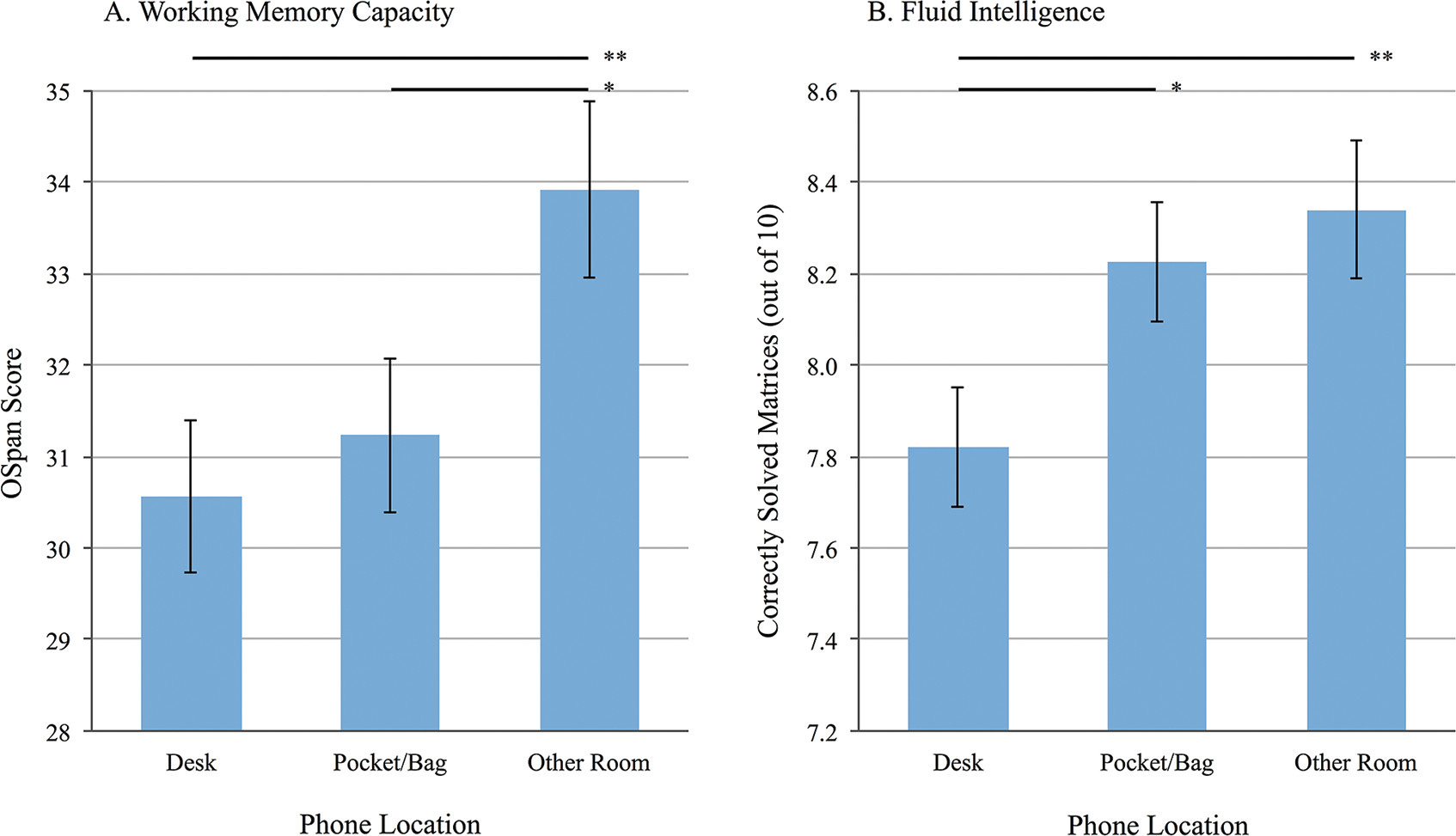 It doesn’t matter if you’re ignoring your phone, whether it’s on DND or silent, whether the screen is facing up or down, whether it’s in your bag or on your desk. When your phone is simply in the same room as you, your cognitive capacity and working memory both significantly drop in performance. You become temporarily less intelligent.