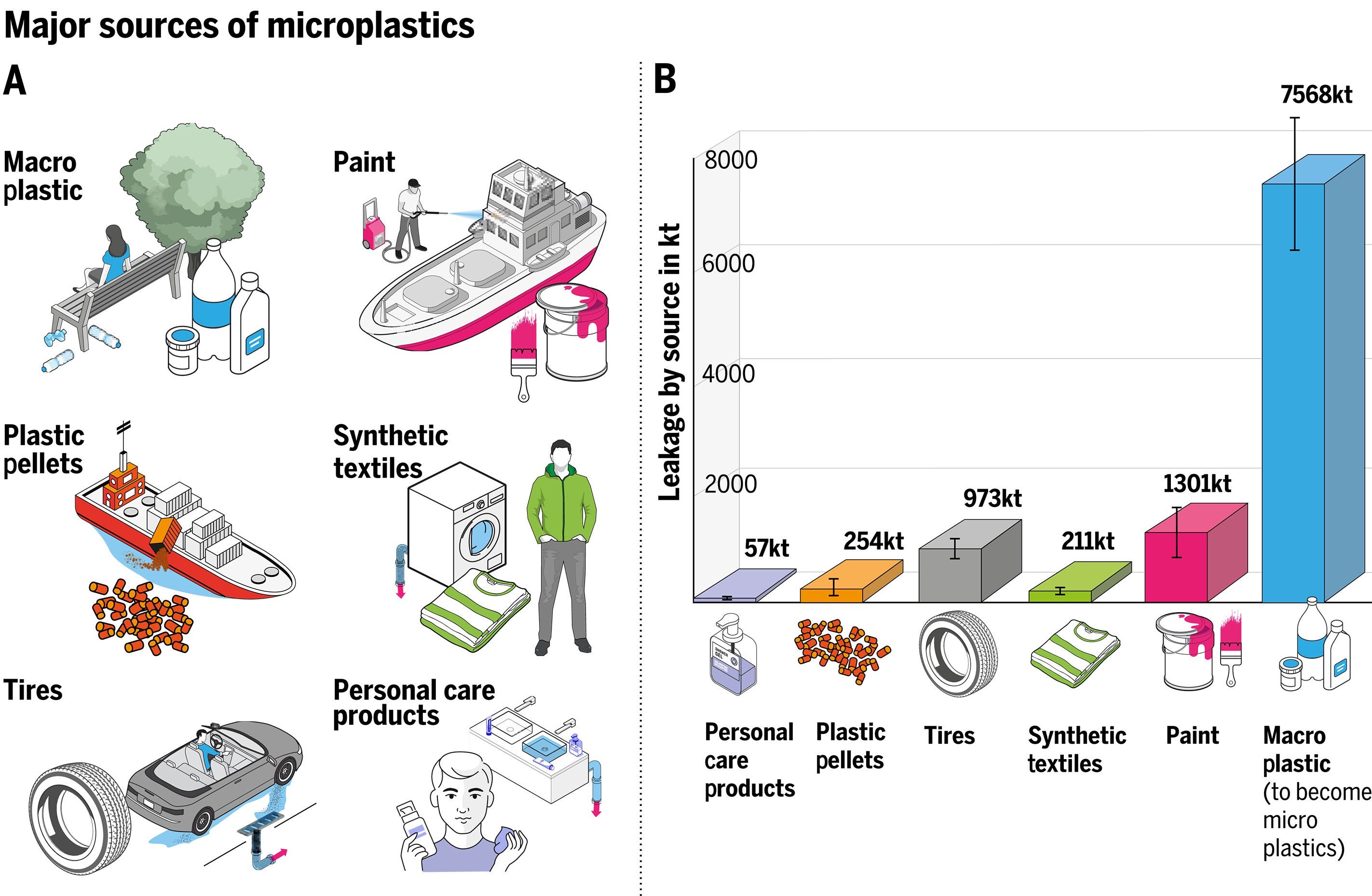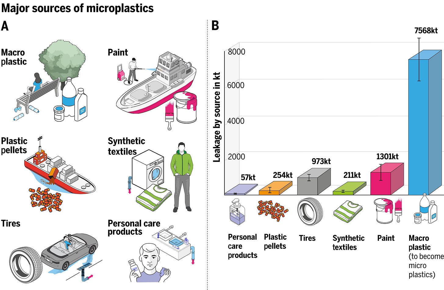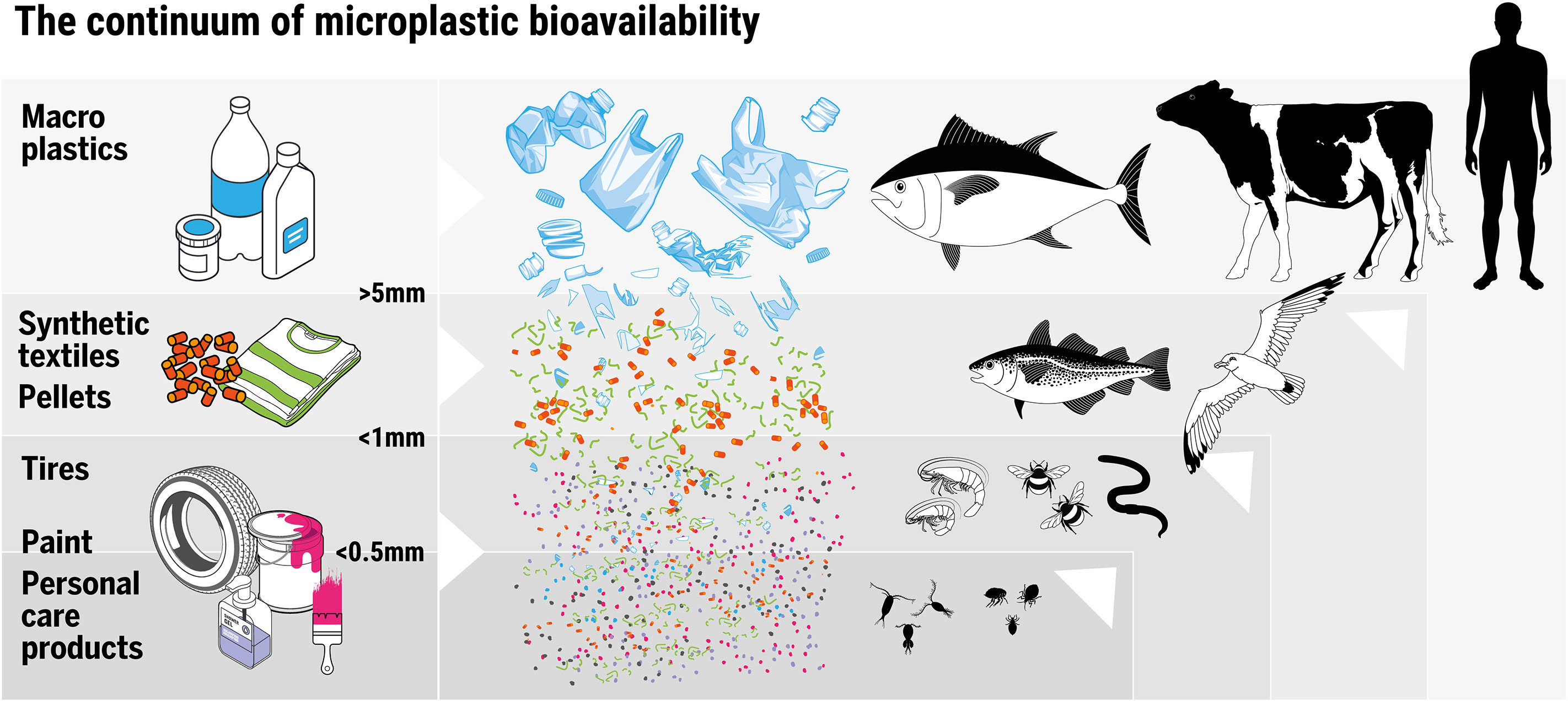 The biggest sources of microplastics are macroplastics (e.g. bottles), tires, synthetic textiles (e.g. polyester), paint, personal care products and plastic pellets. And while we can avoid plastic and legislate through industrial policies – there is still billions of tonnes of plastic in landfill, waiting to be broken down into microplastics that will then become part of our ecosystem through different channels.